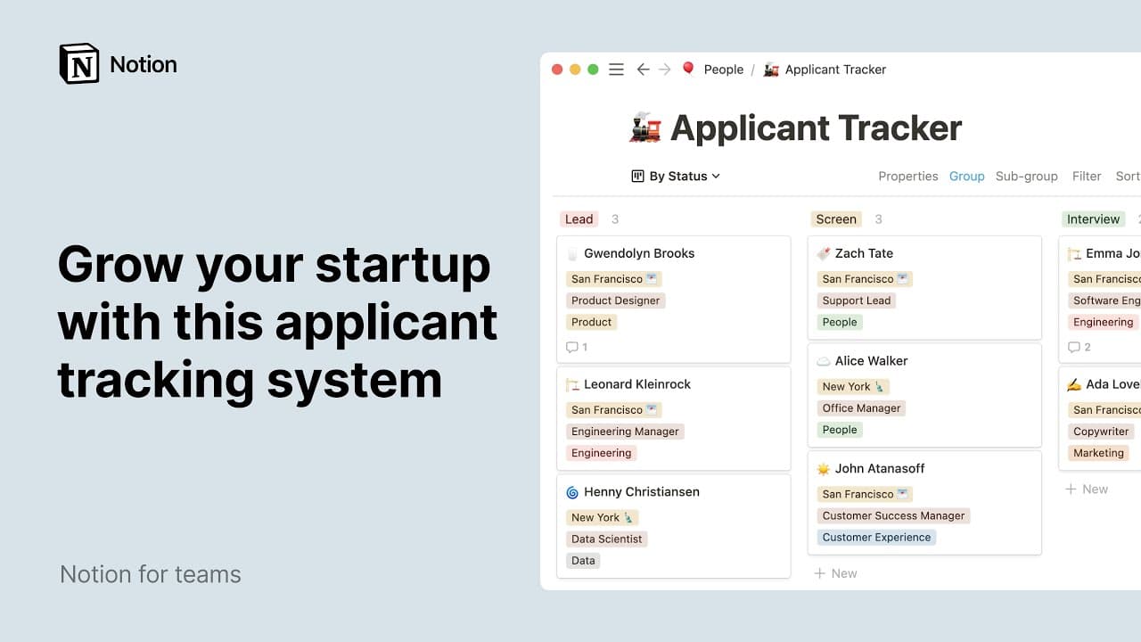 People ops: Grow your startup with this applicant tracking systemOrganization is crucial in hiring. Use Notion to tag and filter candidates based on the teams they’d join, and where they’re at in the interview process.